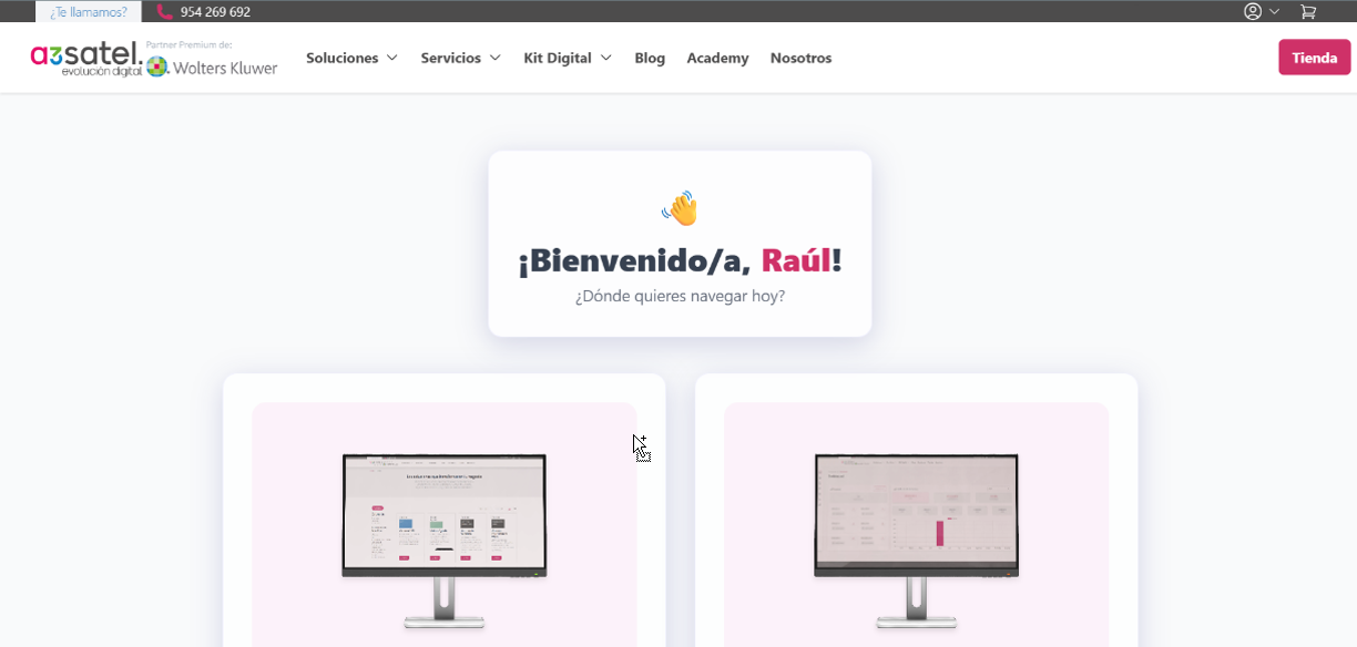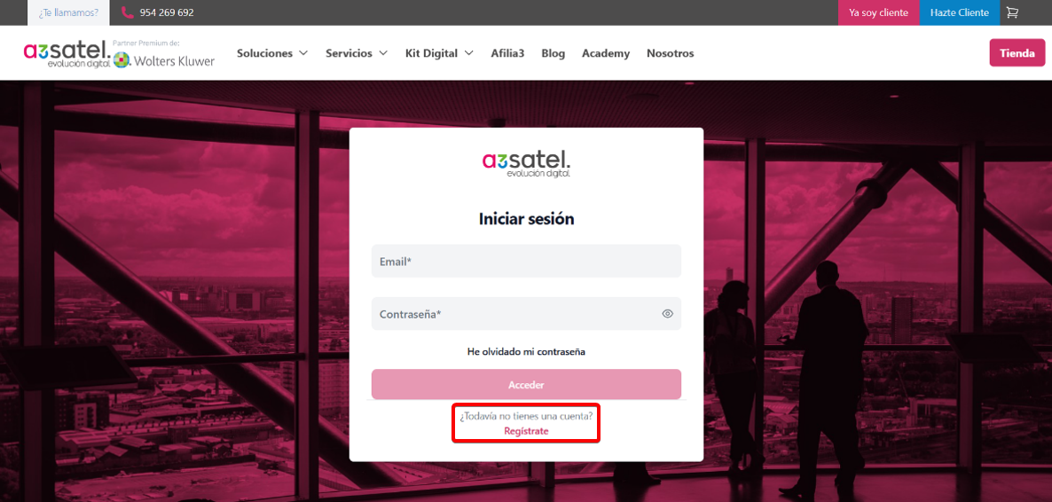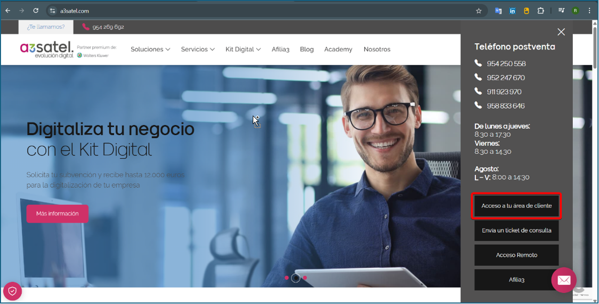 - Acceda a nuestra web www.a3satel.com y pulse sobre el botón situado en la parte superior derecha Ya soy cliente.