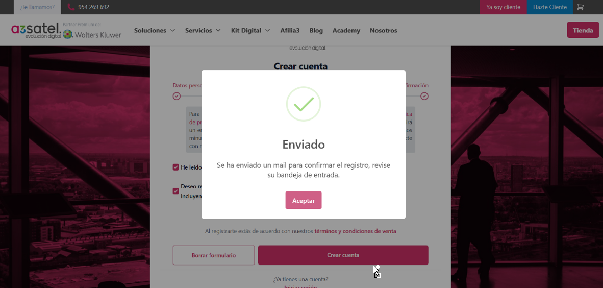 - A continuación, rellene los datos recordando que el email con el que se dé de alta será con el que deberá acceder posteriormente y será sobre el que se trabaje en el caso de que deba Recuperar la contraseña. Recuerde que en esta fase deberá rellenar datos personales de acceso, datos de la empresa que se va a dar el alta y una última página confirmación.
