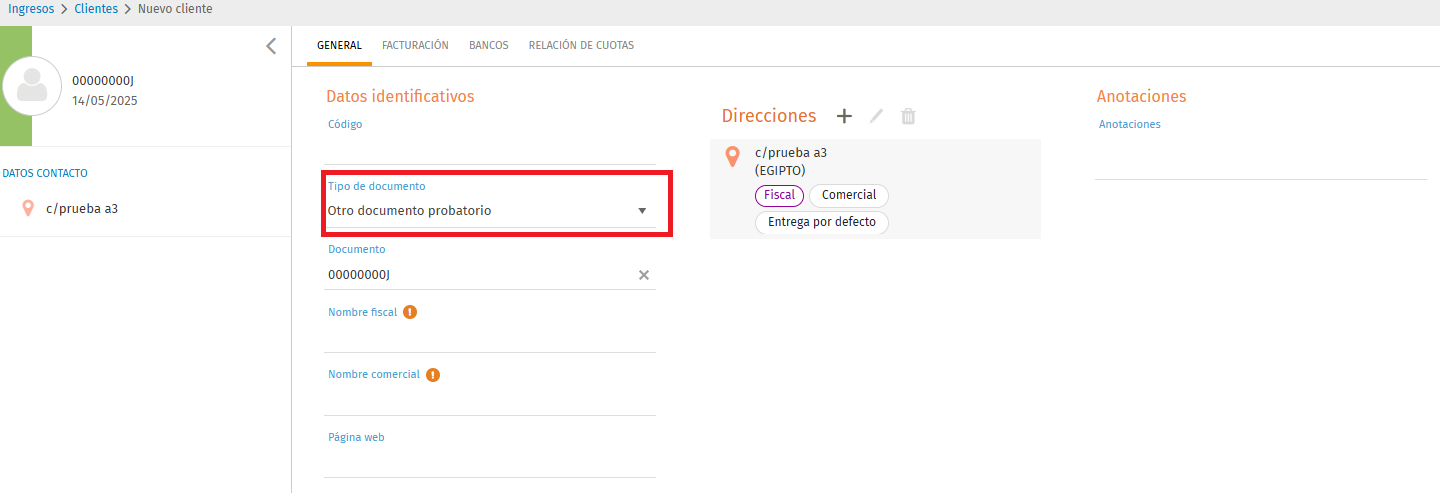 Para poder facturar a un cliente que tiene identificación nacional (DNI/NIE), pero la dirección fiscal es extranjera, se debe informar en el "tipo de documento" en la ficha del cliente "Otro documento probatorio", tal y cómo muestra la siguiente imagen: